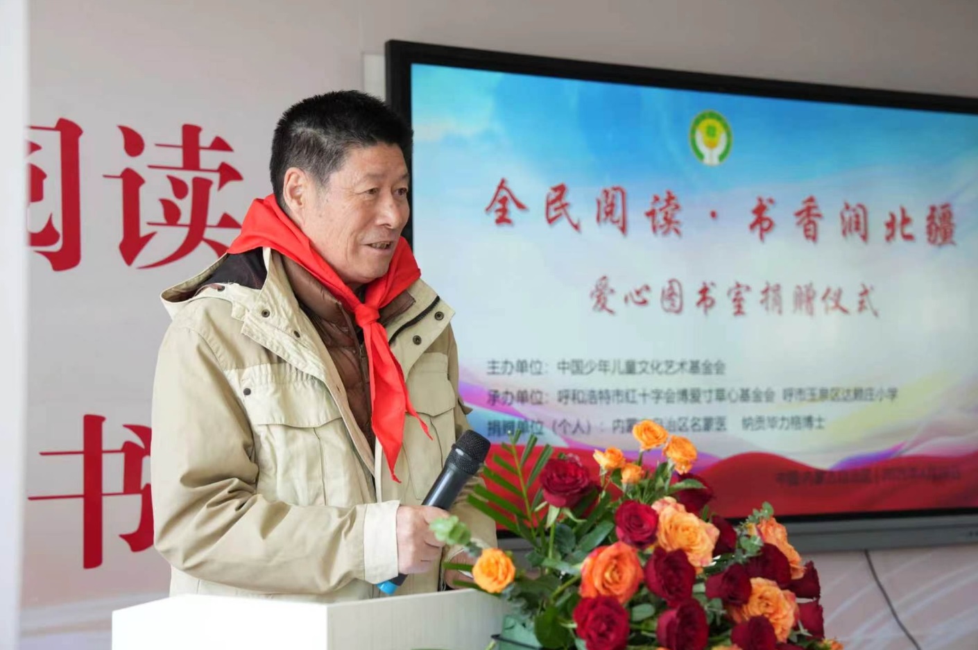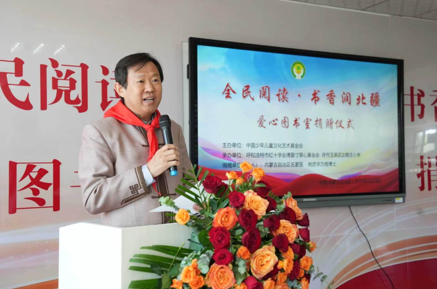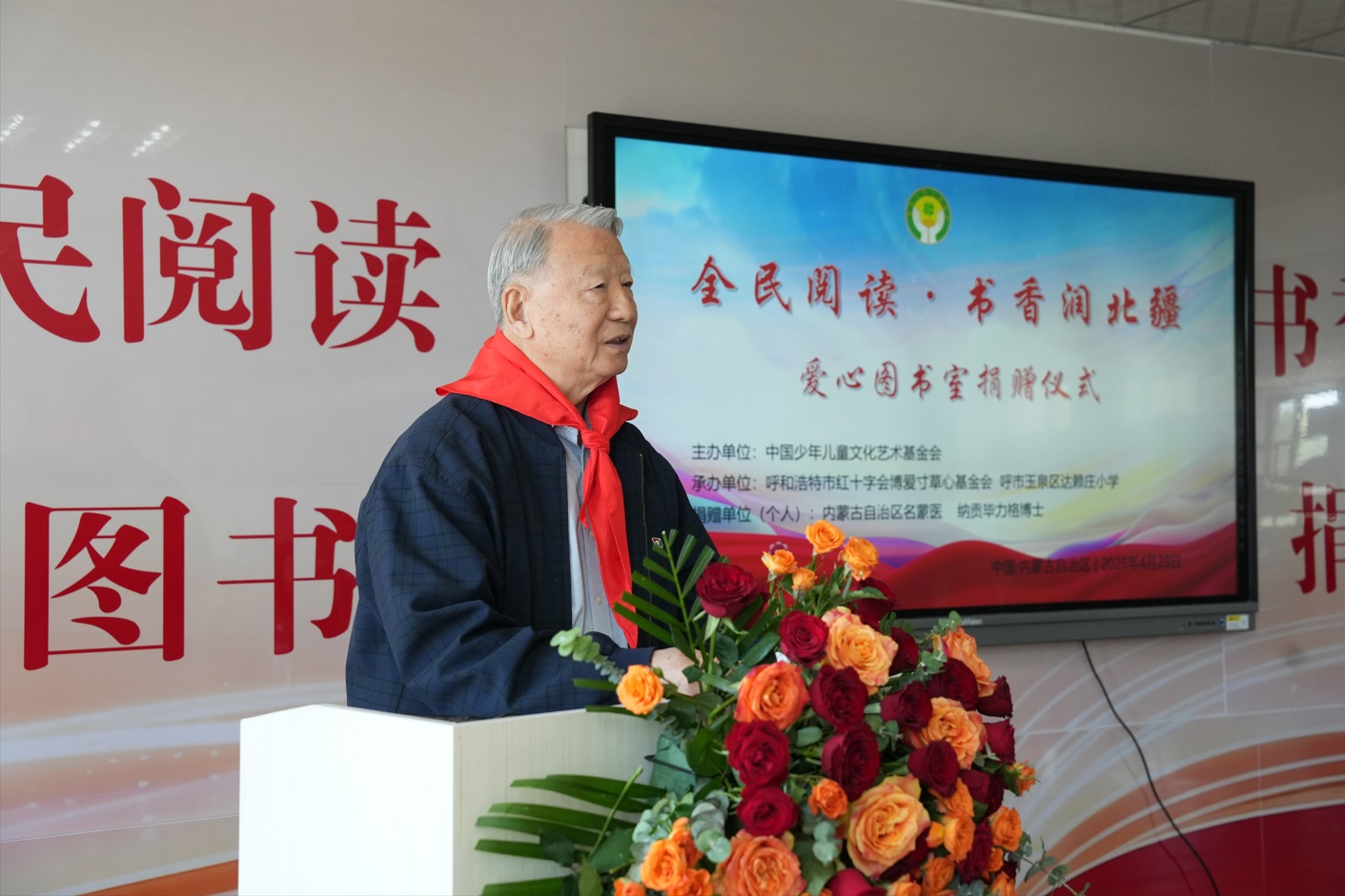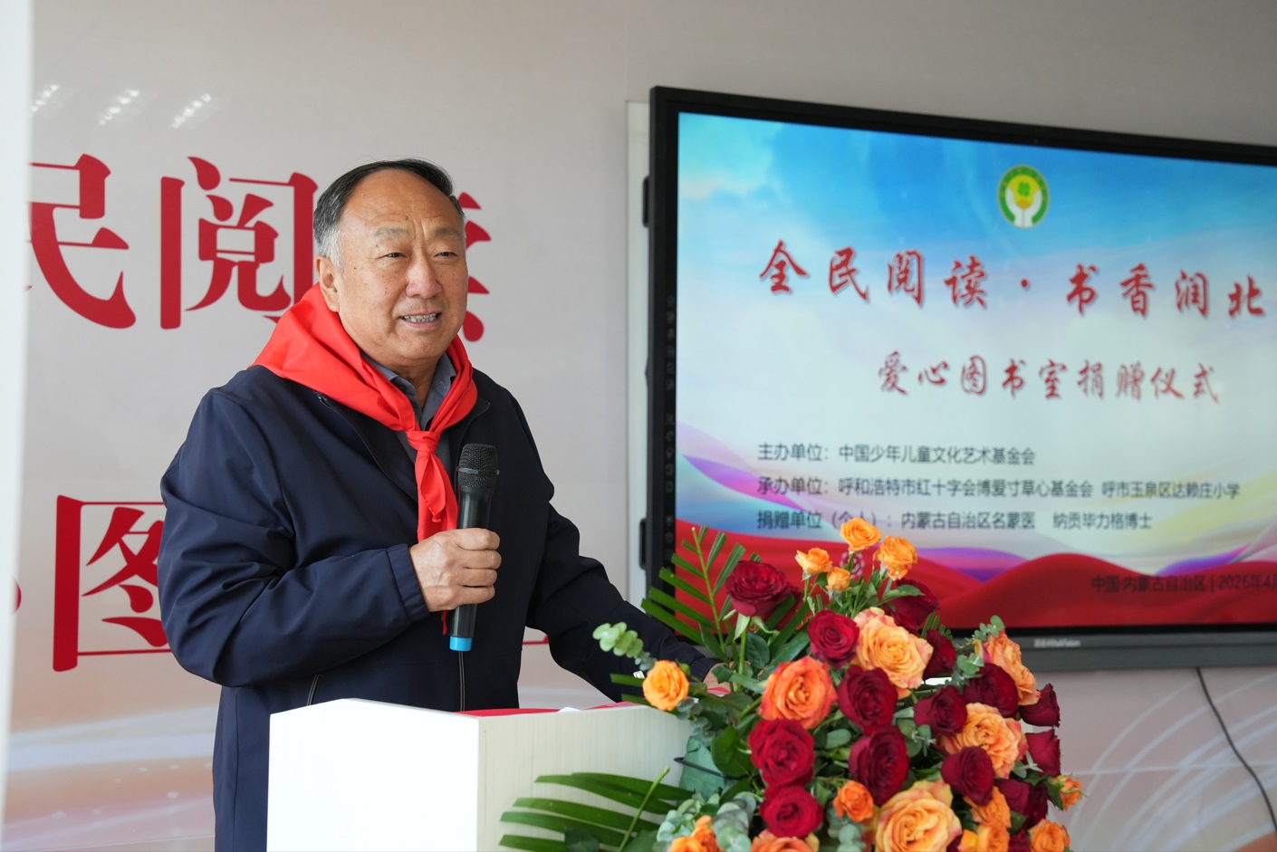 仪式在庄重热烈的氛围中拉开帷幕。少先队员代表为各位领导、嘉宾佩戴红领巾,致以最崇高的敬意。全国人大第十、十一届外事委副主任马文普在致辞中指出,少年儿童是祖国的未来、民族的希望,全民阅读是提升国民素质、筑牢文化自信的重要工程。他对本次爱心图书室捐赠活动给予高度评价,强调社会各界力量参与乡村教育公益,是推动教育均衡发展、促进民族团结进步的生动实践,鼓励更多爱心人士投身文化公益事业,以书香滋养童心,以爱心助力成长,让阅读成为草原少年成长路上的坚实力量。